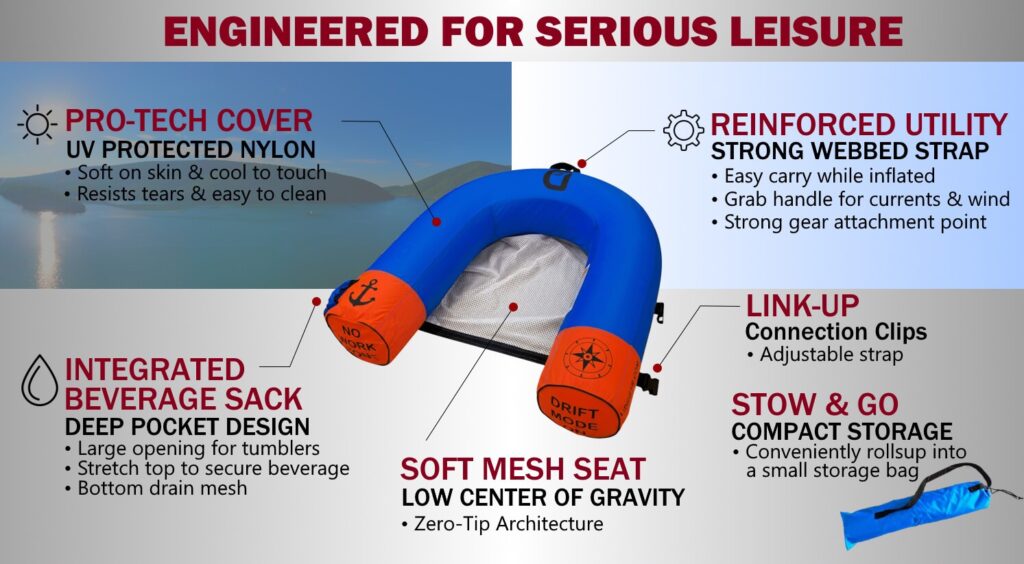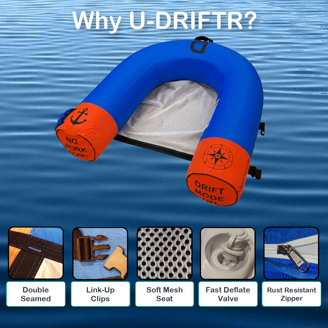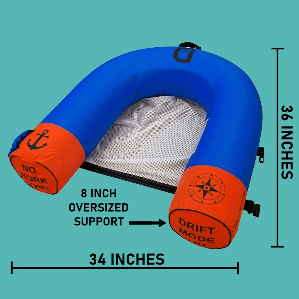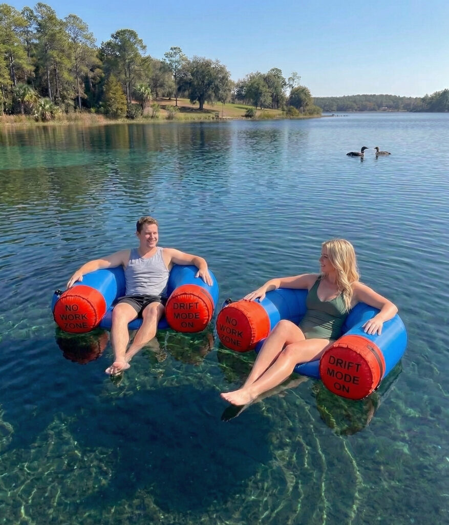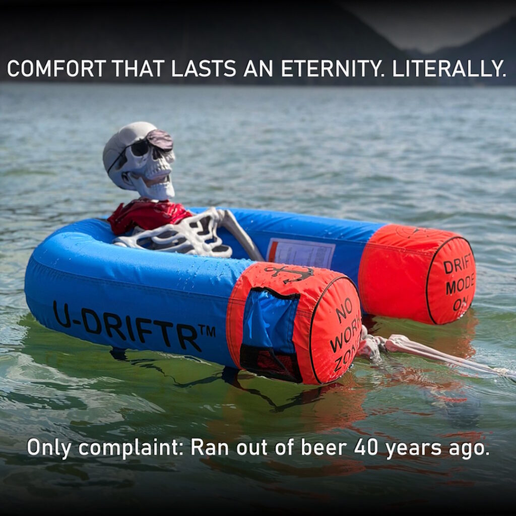 SIDE EFFECTS OF THE U-DRIFTR™ MAY INCLUDE: An uncontrollable urge to flip the bird to the foreman on Monday morning; spontaneous rage-quitting of unfulfilling desk jobs; dangerously low levels of giving a shit—if any at all; blatant, mid-meeting daydreams about floating away while your boss drones on about “synergy”; and an absolute inability to tolerate any type of blowup pool toy. If you experience zero stress for more than 4 hours, do not seek medical attention—just keep drifting. U-DRIFTR™ is not responsible for your sudden lack of a career or your newfound addiction to relaxation.